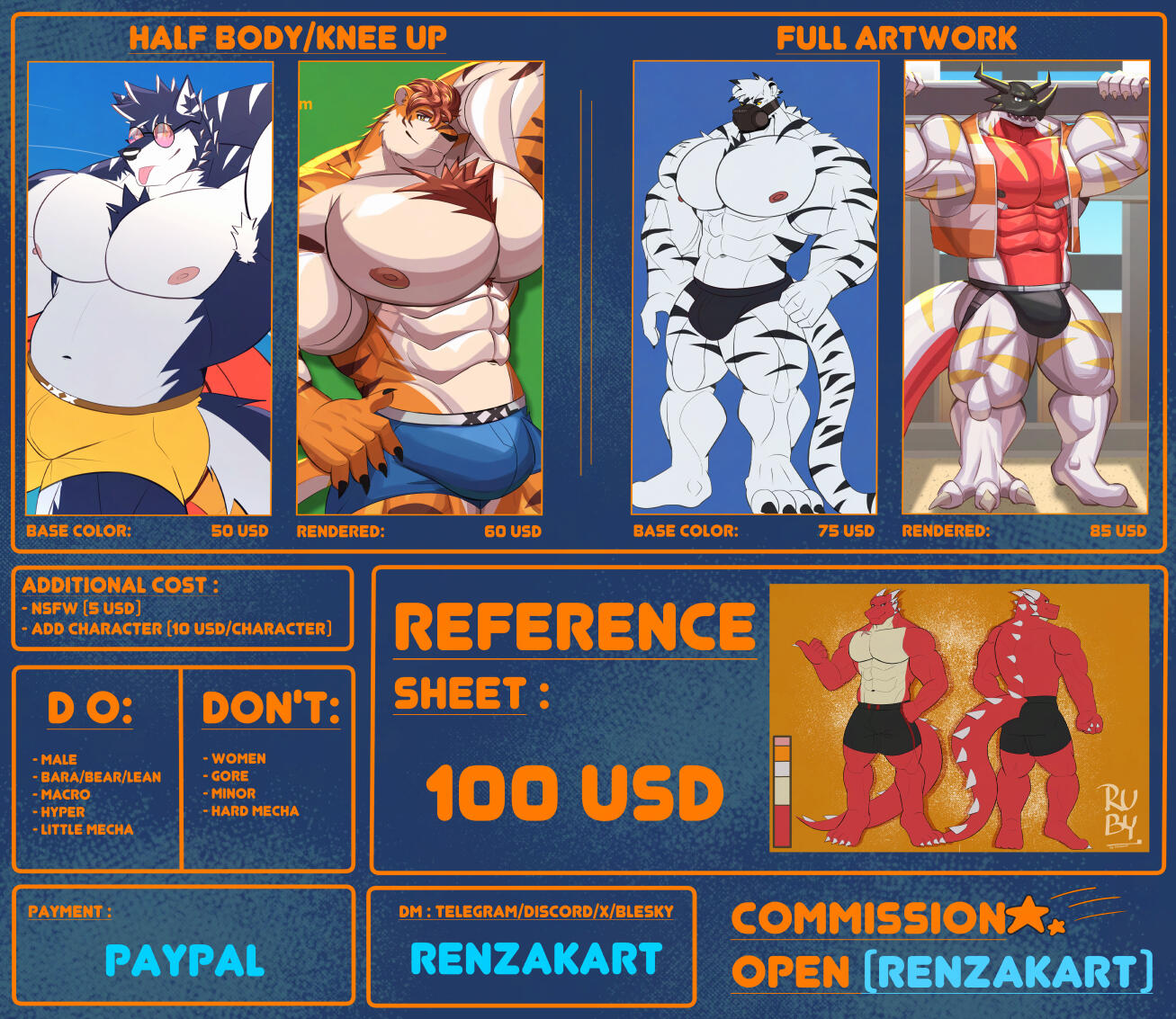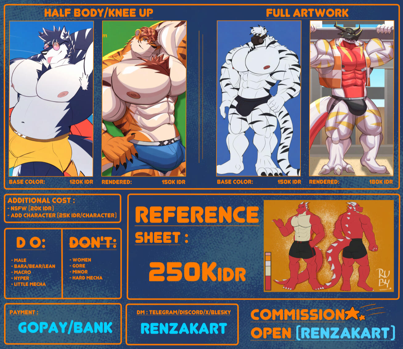 Mostly my art is furry bara thing because is my common goals to make hot bara guys!. But i can draw other but not too detailed like Mecha or else (See my ToS).If you interesting, you can contact me on this button. (noted if you cant use that just search renzakart, both telegram and discord are same)